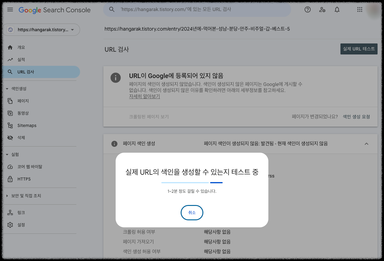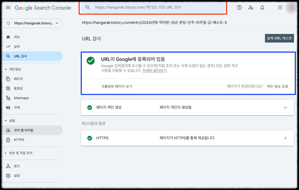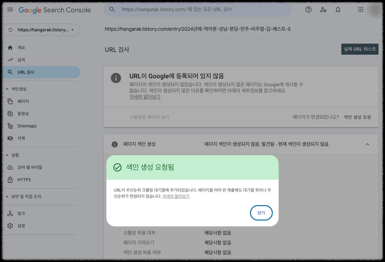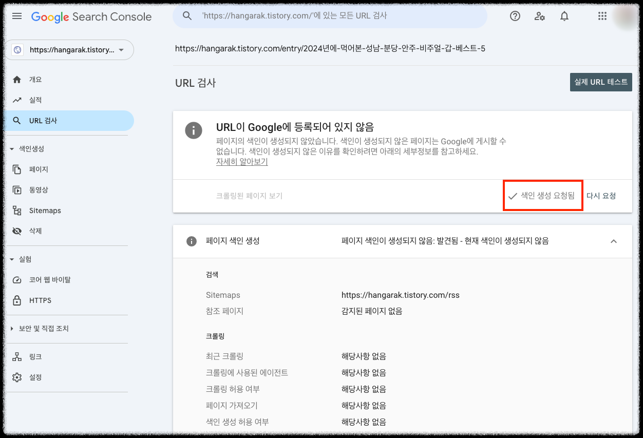 그래서 여기 티스토리 글을 구글 서치콘솔의 개별 URL 색인 요청 기능을 써서 색인을 독촉해 보았습니다.