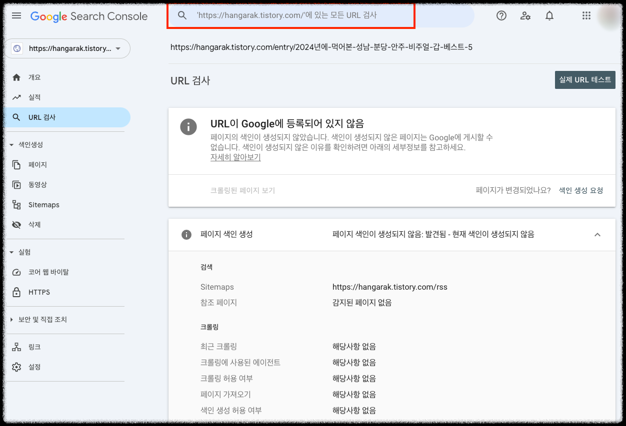 상단의 입력란에 URL을 입력하면 그 URL이 이미 색인이 된 것인지, 아니라면 색인 가능한지 확인하고 후속 진행을 하게 됩니다.