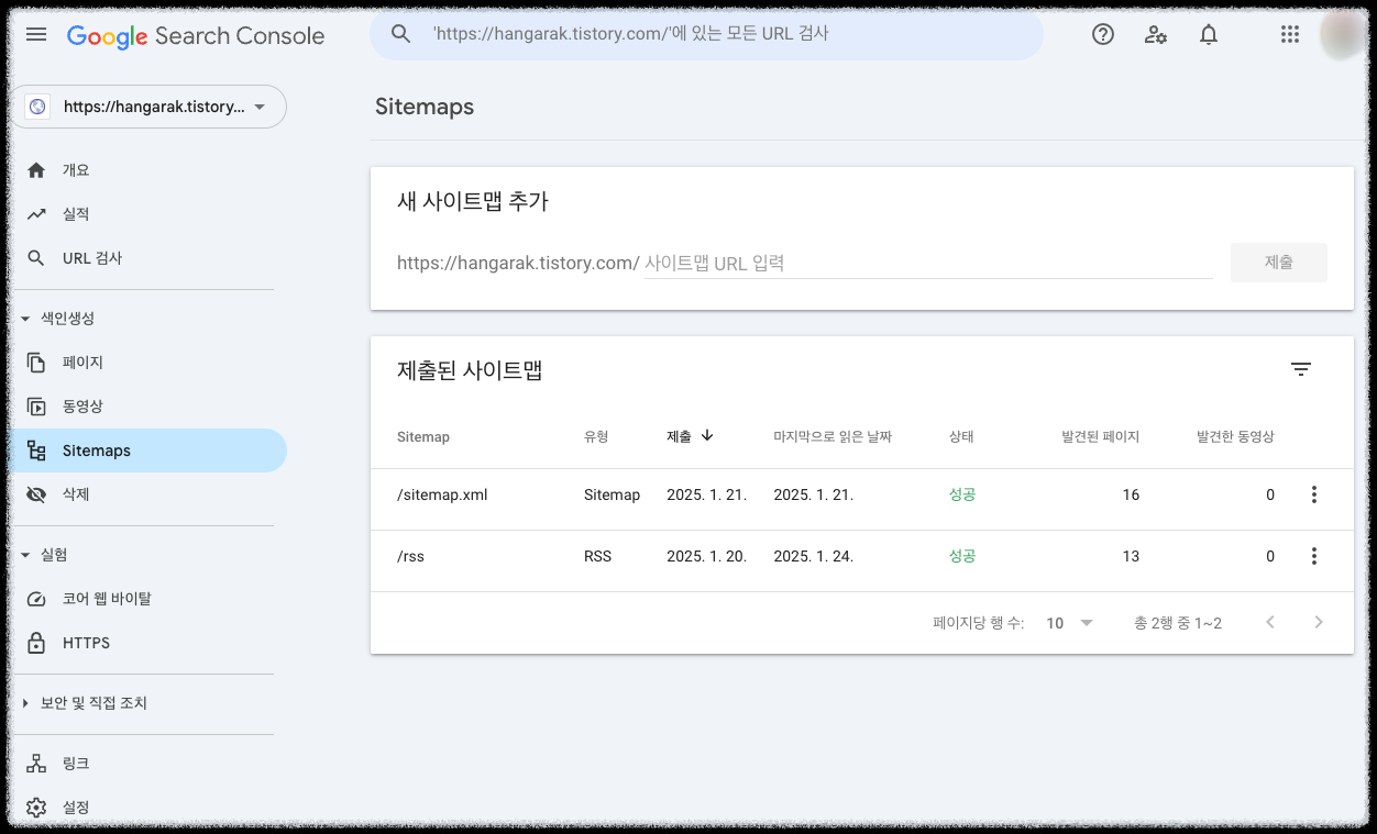 그래서 사이트맵을 지우고, 티스토리가 제공하는 자동 등록 방법으로 했더니 이번에는 성공하더군요.
