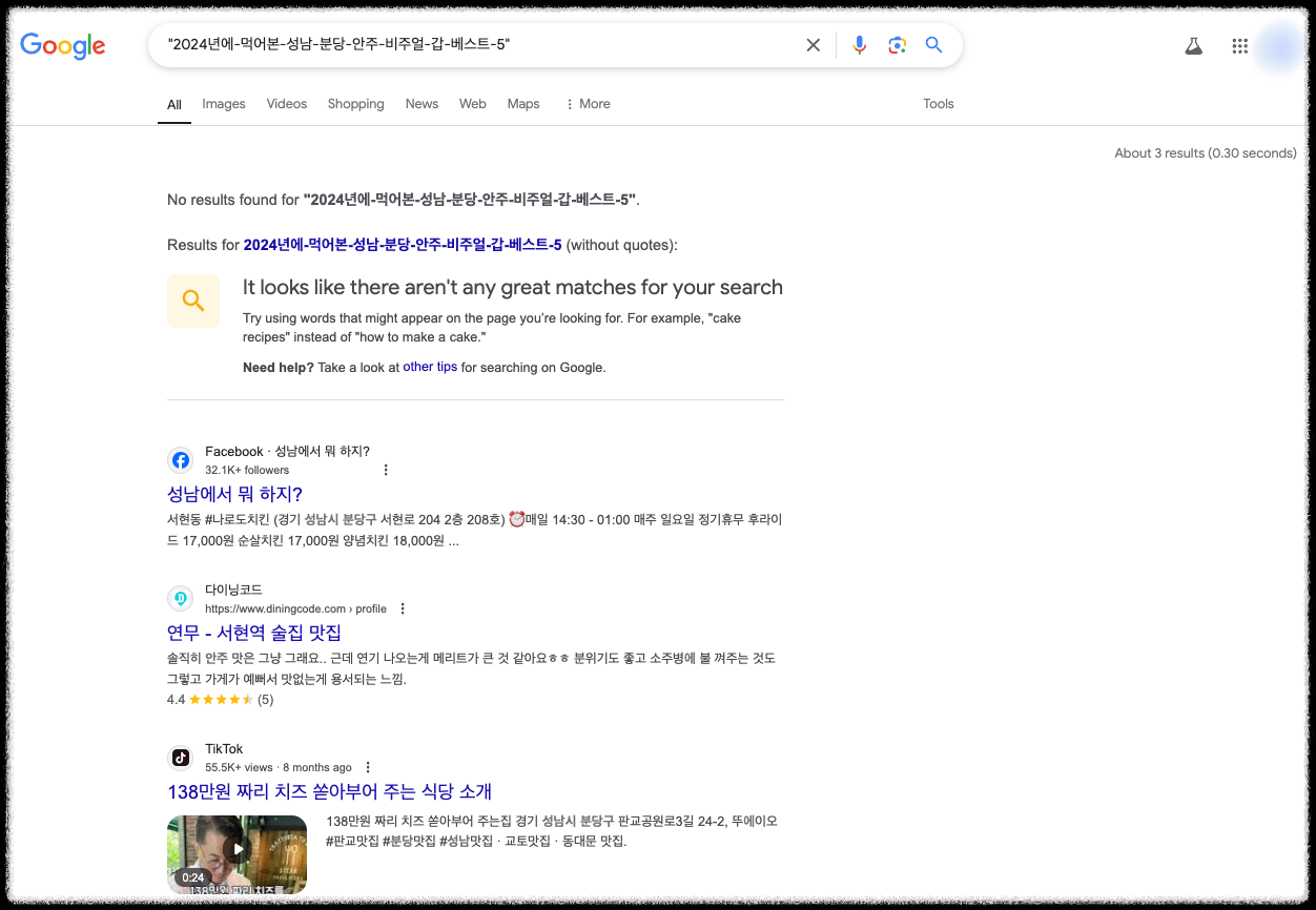 아래에 보면 페이지 색인이 생성되었다고 쓰여있는데 실제 검색해 보면 노출은 되고 있지 않습니다.