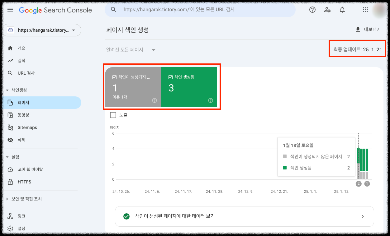 아래 스샷은 2025년 1월 25일에 찍은 것인데 색인 현황 최종 업데이트가 1월 21일입니다. (구글 놀아?)