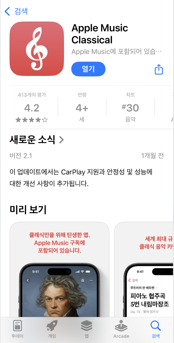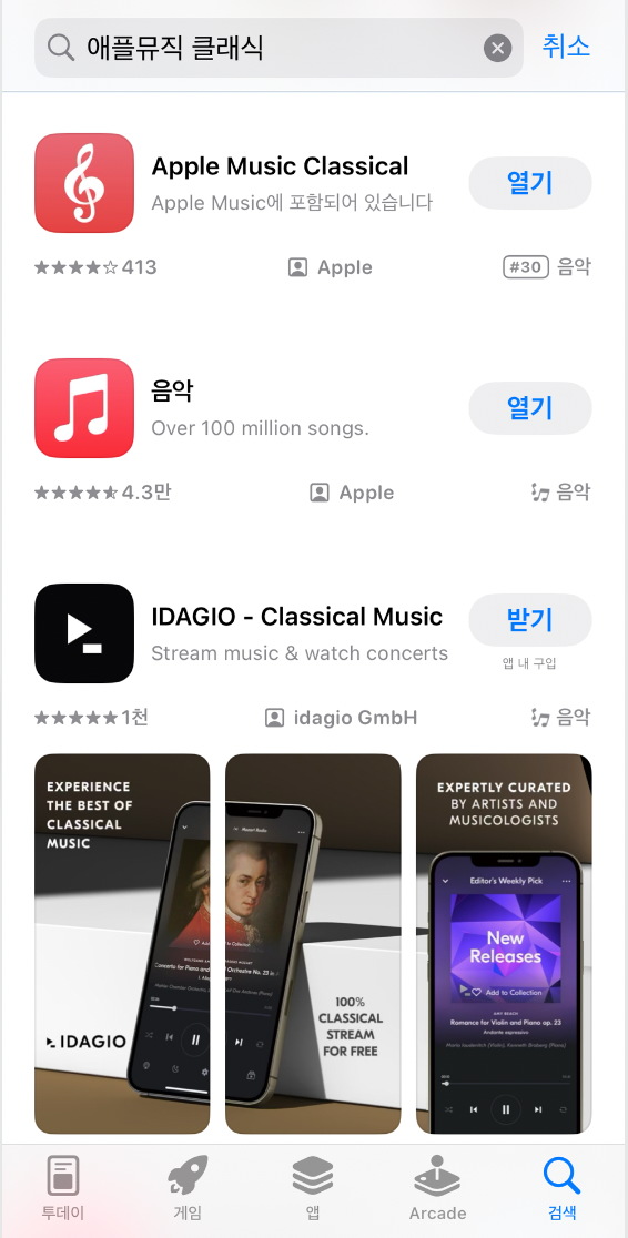 애플뮤직과 애플뮤직 클래식은 별도 모바일 앱으로 되어있어 서로 구분되어있다.