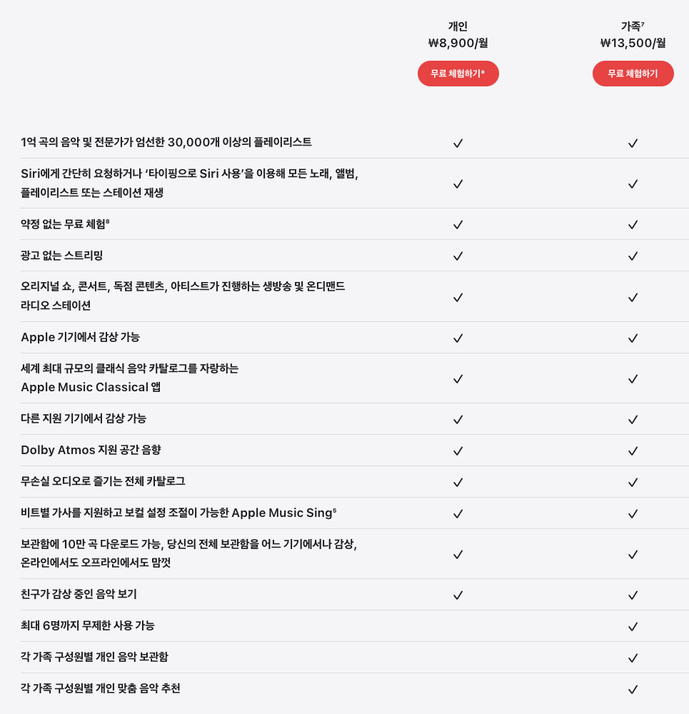 월 구독서비스로 음악 서비스를 누릴 수 있는데 요금제는 아래와 같다.