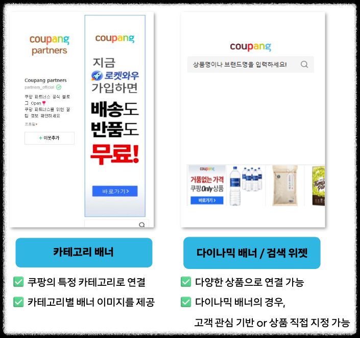 | 다이나믹 배너 | 선택한 카테고리의 베스트 상품이 움직이는 이미지로 제공 (ex: 파트너스 추천, 카테고리 베스트, 고객 관심기반 추천 등) |