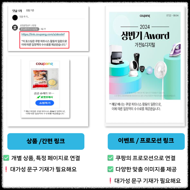 배너와 위젯 형태는 대가성 문구가 필요없으나 상품 링크, 간편 링크, 이벤트 / 프로모션 링크는 댓가성 문구를 반드시 표시해야 합니다.